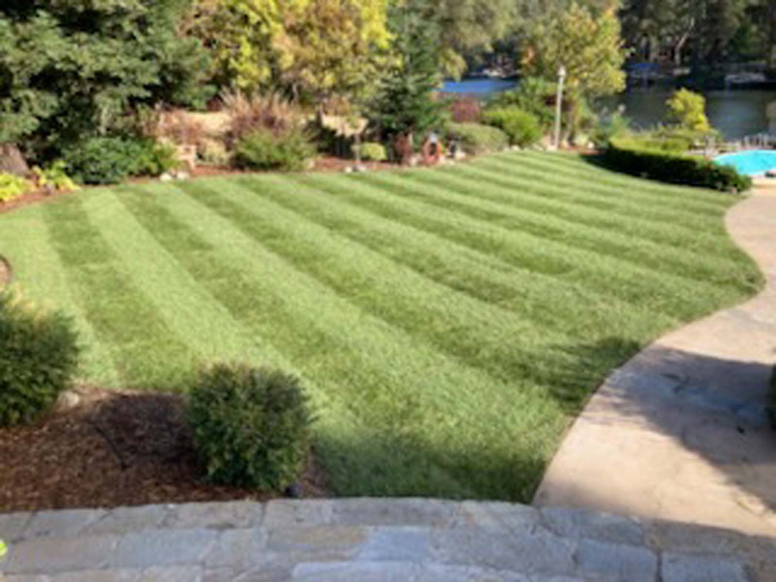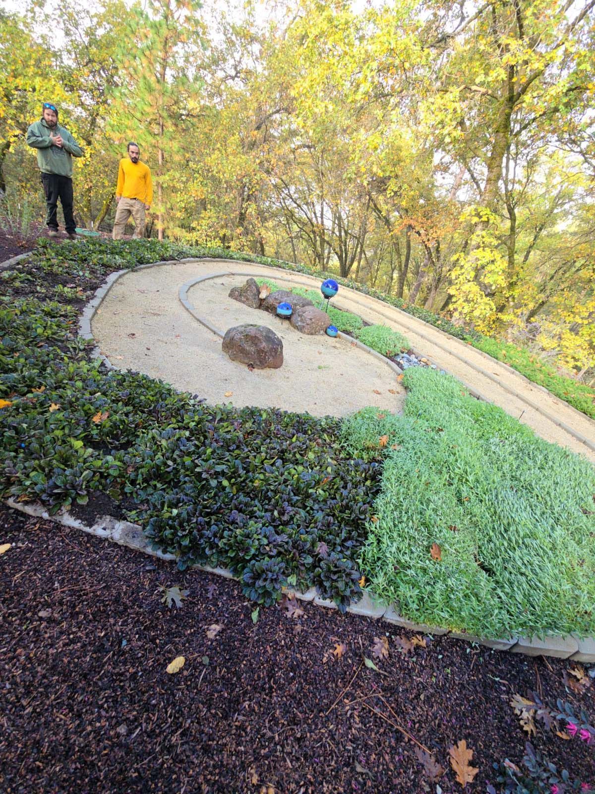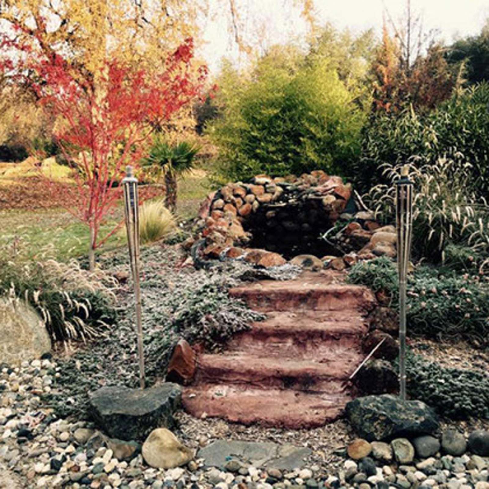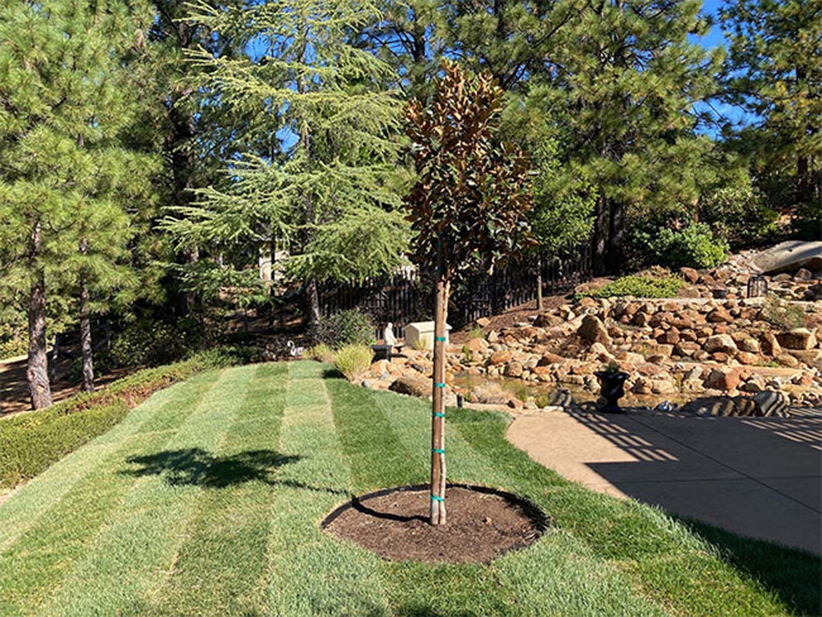 Flower and plant installations, sod, and water features.